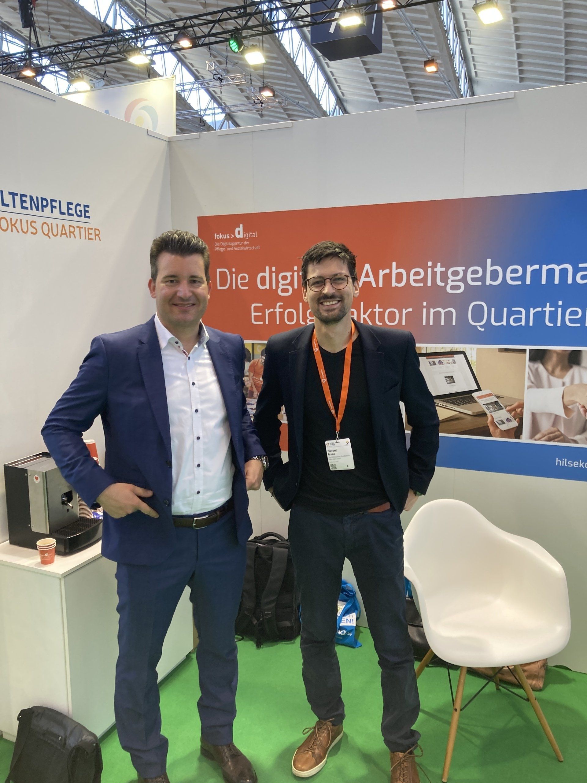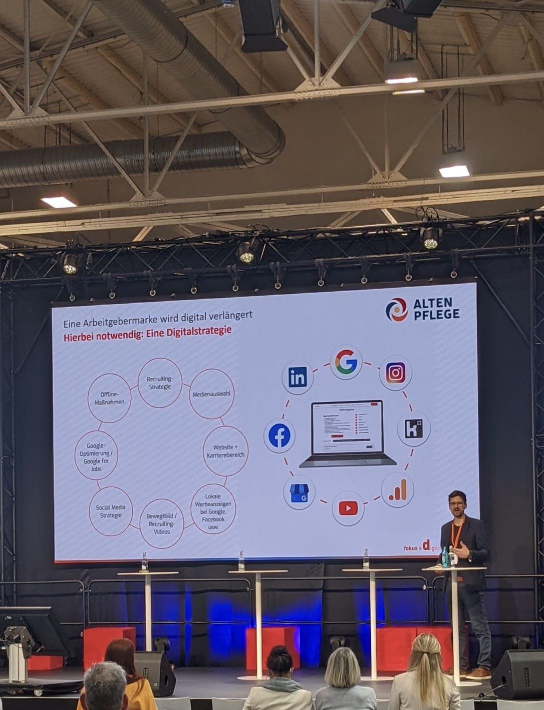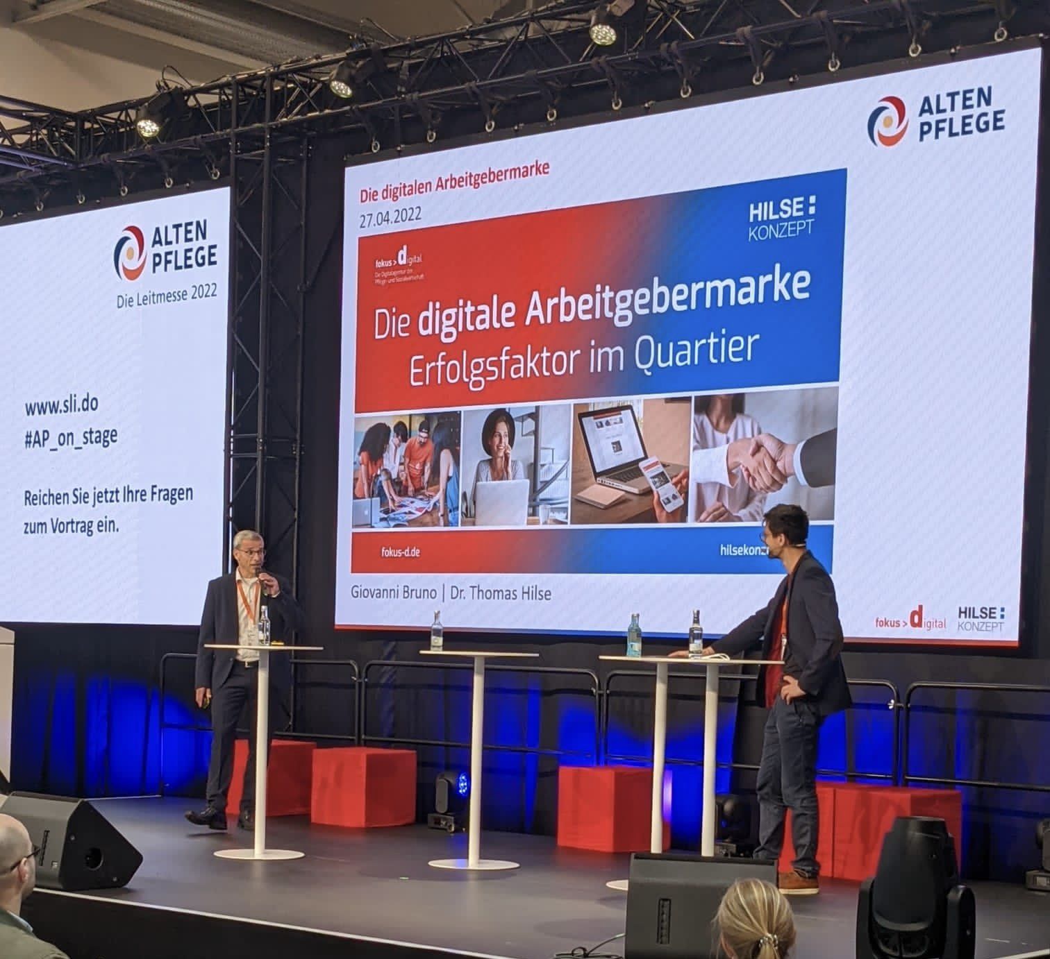 Unser ganz persönliches Highlight war der gemeinsame Vortrag von unserem Geschäftsführer Giovanni Bruno und Dr. Thomas Hilse von HILSE:Konzept zum Thema „Die digitale Arbeitgebermarke. Erfolgsfaktor im Quartier”. Interessierte Pflegeanbieter konnten hier erfahren, wie sie sich mit einer attraktiven und digital verlängerten Arbeitgebermarke als Arbeitgeber in ihrer Region glaubwürdig präsentieren und somit mehr Anfragen von hochwertigen Kandidat:innen erhalten können.