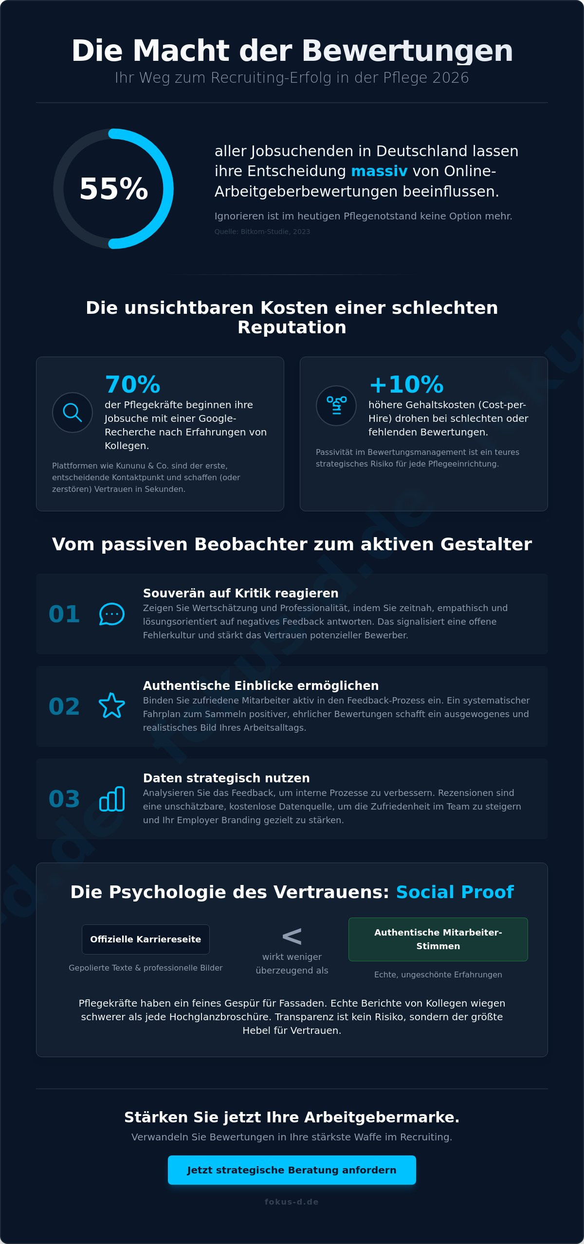 Der Mut zur Transparenz ist in der Pflegebranche der Schlüssel zur Zukunftsfähigkeit. Wer sich den Bewertungen stellt und den Dialog sucht, gewinnt mehr als nur neue Mitarbeiter. Er gewinnt Vertrauen und Loyalität. Wir bei Fokus-D wissen, vor welchen täglichen Herausforderungen Pflegeeinrichtungen stehen. Unser Ziel ist es, Sie als verlässlicher Partner dabei zu unterstützen, Ihre Stärken sichtbar zu machen.