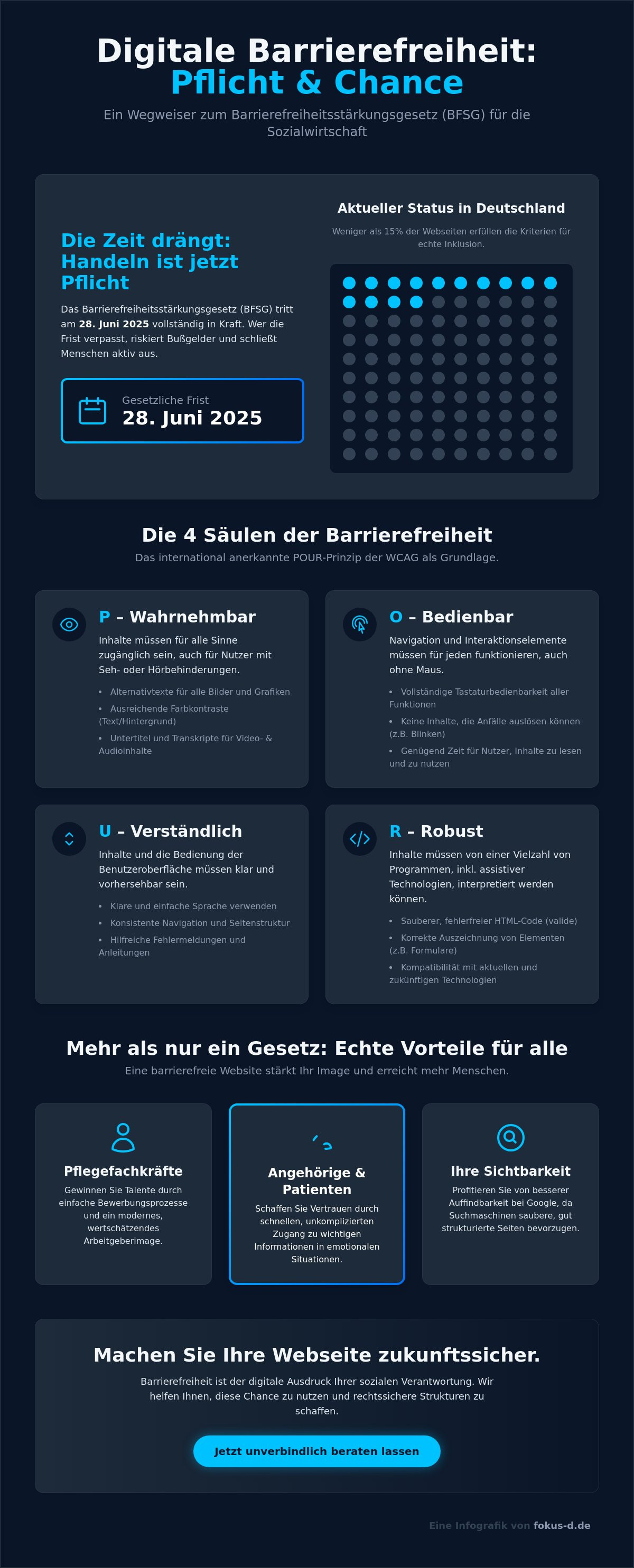 Die digitale Welt wandelt sich rasant. Ab Juni 2025 verpflichtet das Barrierefreiheitsstärkungsgesetz (BFSG) viele Unternehmen in Deutschland dazu, digitale Hürden konsequent abzubauen. Für Pflege- und Sozialeinrichtungen ist das weit mehr als eine gesetzliche Pflicht, es ist eine enorme Chance für die Mitarbeitergewinnung. Wir von der fokus digital GmbH begleiten Sie dabei als spezialisierter Partner. Unser Ansatz vereint Technik, Design und Employer Branding aus einer Hand. Wir sorgen dafür, dass Ihre Einrichtung online genau die Wertschätzung ausstrahlt, die Ihre Teams täglich vor Ort leisten.