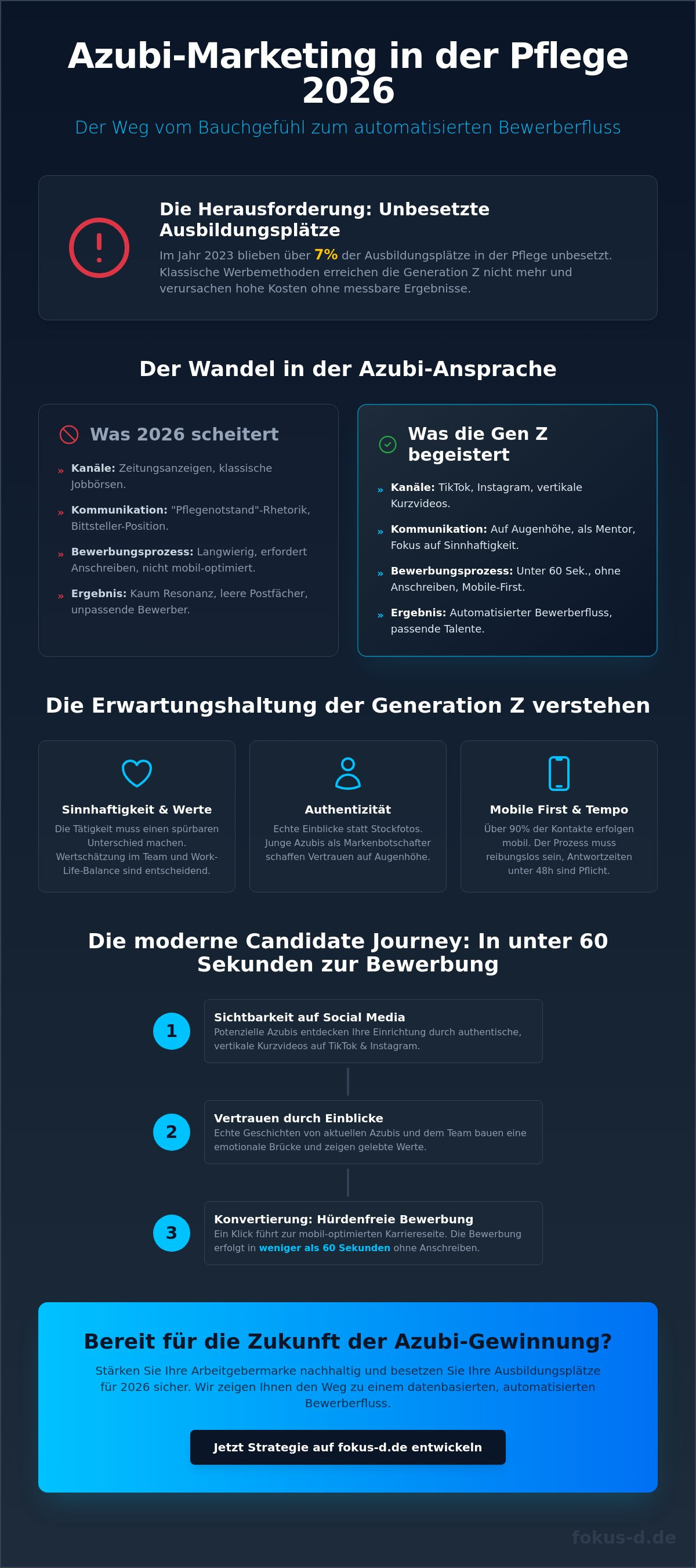 - Lernen Sie, wie moderne digitale Strategien beim Azubi-Marketing in der Pflege Hürden wie Anschreiben eliminieren und den Bewerbungsprozess auf unter 60 Sekunden verkürzen.