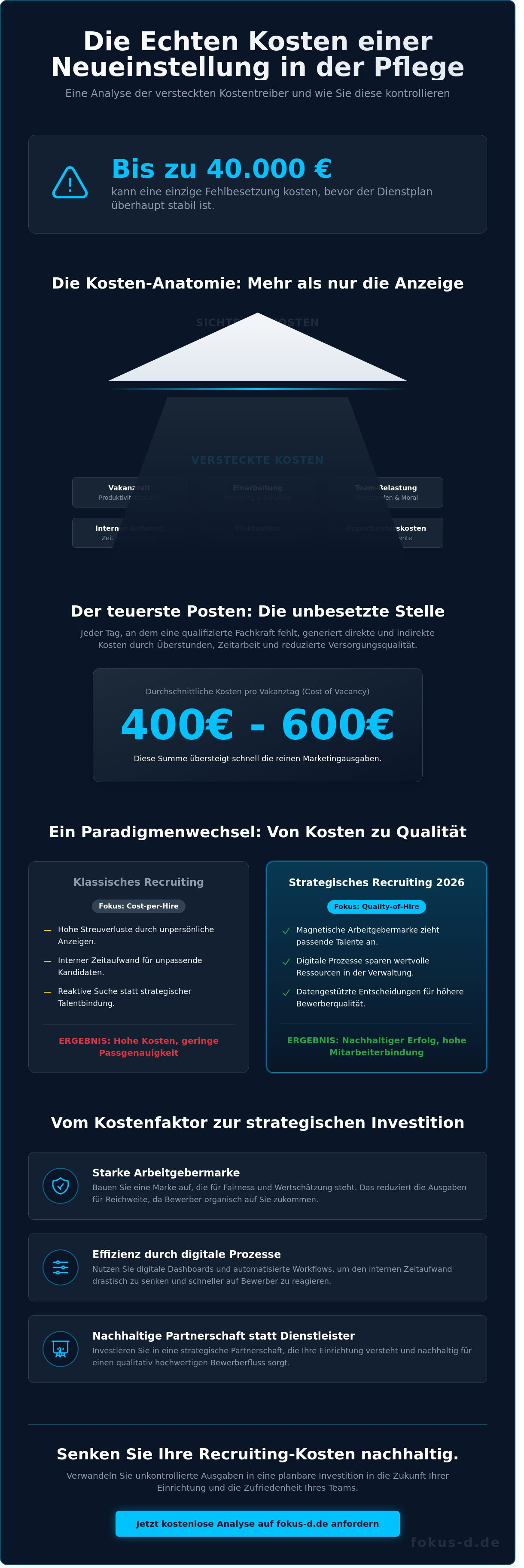 Die Suche nach qualifizierten Fachkräften in der Pflege hat sich grundlegend gewandelt. Wer heute lediglich die Rechnung eines Anzeigenportals betrachtet, sieht nur die Spitze des Eisbergs. Die echte Kosten einer Neueinstellung in Pflegeeinrichtungen setzen sich im Jahr 2026 aus einer komplexen Mischung aus direkten Ausgaben, internem Zeitaufwand und den oft unterschätzten Opportunitätskosten zusammen. Ein rein transaktionales Denken, bei dem Stellenanzeigen wie Waren eingekauft werden, führt in der modernen Pflegelandschaft unweigerlich zu teuren Fehlentscheidungen.
