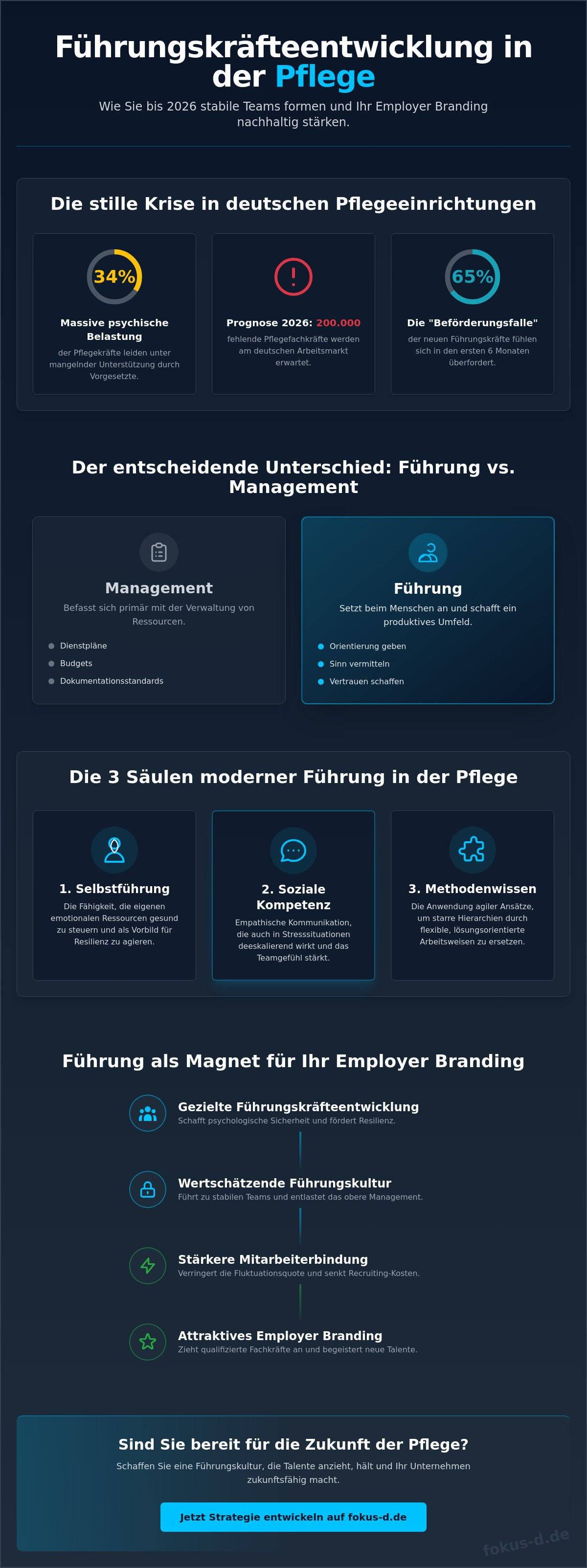 Fokus-D steht Ihnen als Partner zur Seite, der tief in der Pflege- und Sozialwirtschaft verwurzelt ist. Wir liefern Ihnen messbare Erfolge durch unser datengetriebenes Recruiting und bieten eine empathische Beratung, die Ihre individuellen Bedürfnisse versteht. Gemeinsam etablieren wir Führungsmethoden, die Ihre Teams stabilisieren und die Fluktuation nachhaltig senken. Wir begleiten Sie dabei, eine Unternehmenskultur zu prägen, in der Professionalität und menschliche Wärme Hand in Hand gehen.