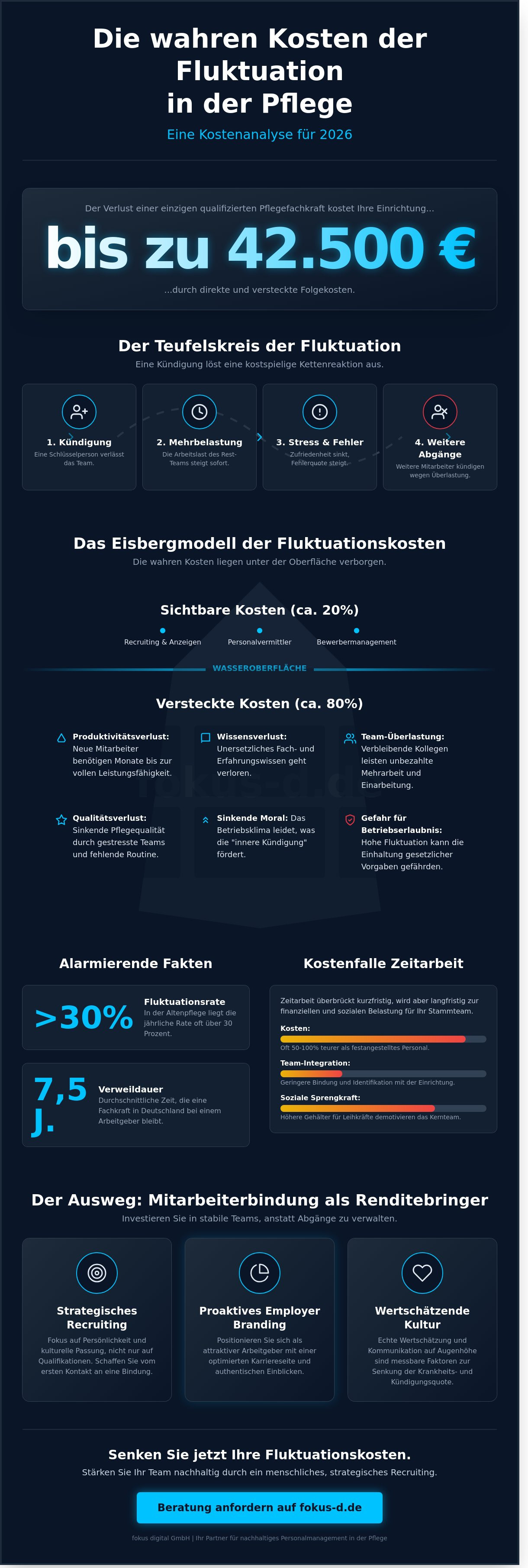- Identifizieren Sie die wahren Kosten der Fluktuation von Pflegepersonal mithilfe des Eisbergmodells, das neben sichtbaren Recruiting-Ausgaben auch versteckte Belastungen wie Wissensverlust aufdeckt.