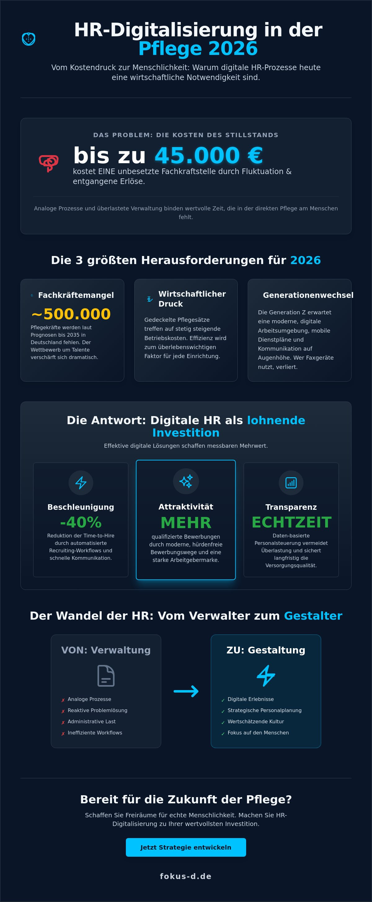 Wussten Sie, dass eine einzige unbesetzte Fachkraftstelle in der deutschen Pflegebranche laut aktuellen Branchenanalysen bis zu 45.000 Euro an Fluktuationskosten und entgangenen Erlösen verursacht? Dieser wirtschaftliche Druck paart sich oft mit einer überlasteten Verwaltung, die in analogen Prozessen feststeckt und wertvolle Zeit für das Wesentliche raubt: den Menschen. Sicherlich spüren auch Sie täglich, dass herkömmliche Methoden kaum noch ausreichen, um im Wettbewerb um qualifizierte Köpfe zu bestehen. Wir verstehen diese Herausforderung und zeigen Ihnen in diesem Leitfaden, warum die HR-Digitalisierung als lohnende Investition weit mehr als nur ein technisches Upgrade ist.