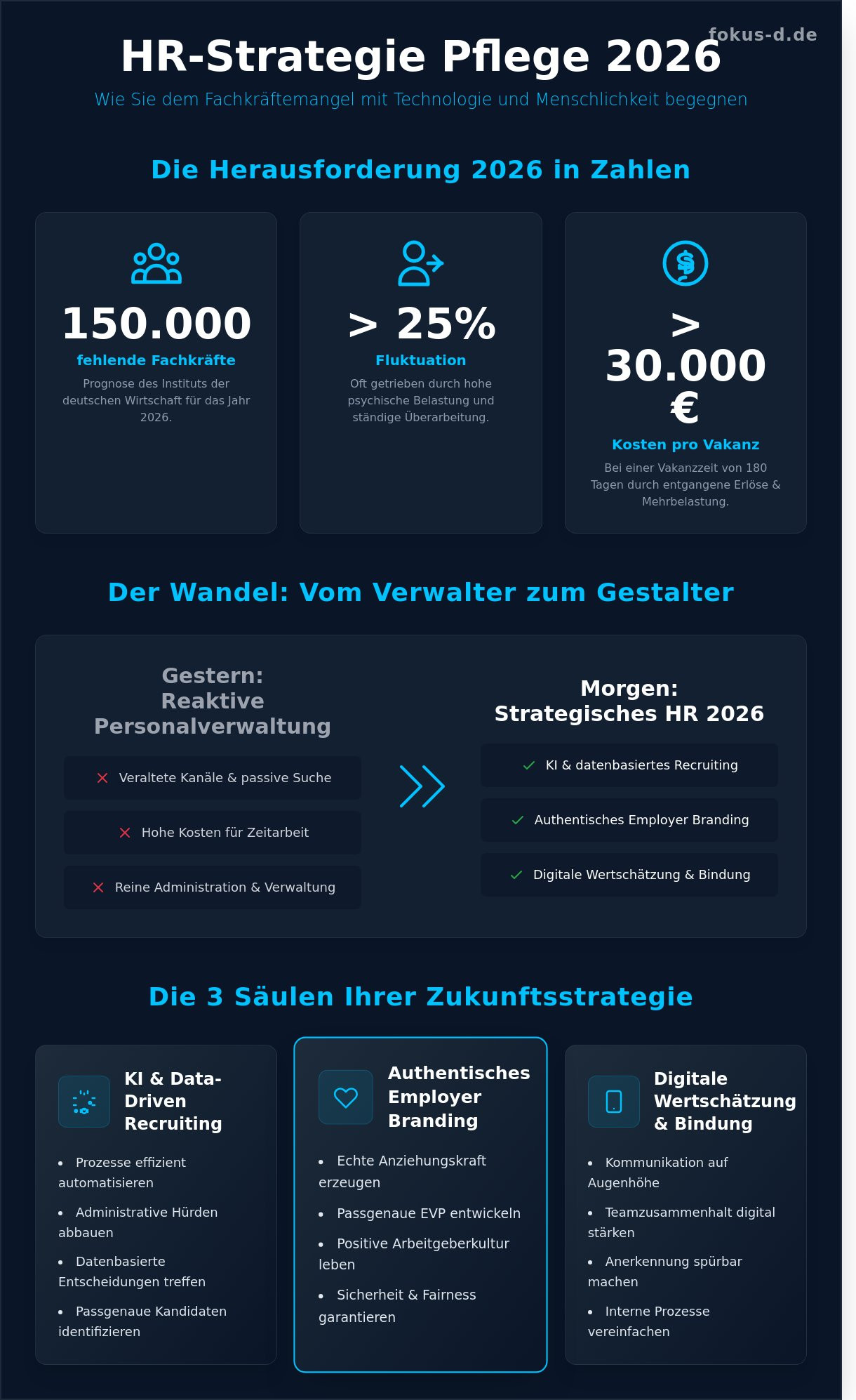 Die Rolle der Geschäftsführung ist dabei entscheidend. Sie ist der Treiber, der Ressourcen für digitale Lösungen freigibt und eine Kultur der Wertschätzung vorlebt. Wir bei Fokus-D unterstützen Einrichtungen dabei, diesen Weg mutig zu gehen. Es geht nicht mehr nur darum, Stellen zu besetzen. Es geht darum, Lebensqualität für Pflegende und Gepflegte gleichermaßen zu sichern.