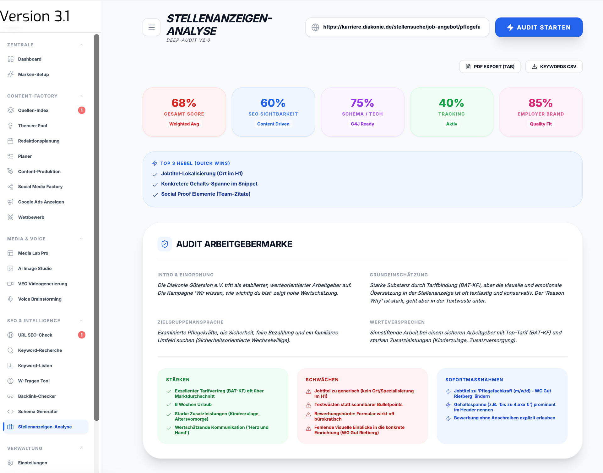 Die Plattform verbindet über 40 zentrale KI-Funktionen in einem Ablauf: Zielgruppen- und Medienverhalten werden abgeleitet, regionale Wettbewerber identifiziert und verglichen, Sichtbarkeits- und Differenzierungshebel aufgezeigt, Stellenanzeigen als Audit bewertet (Inhalt, Arbeitgebermarke, Struktur, Verständlichkeit, Wirkung) und daraus priorisierte Maßnahmenpläne erstellt.