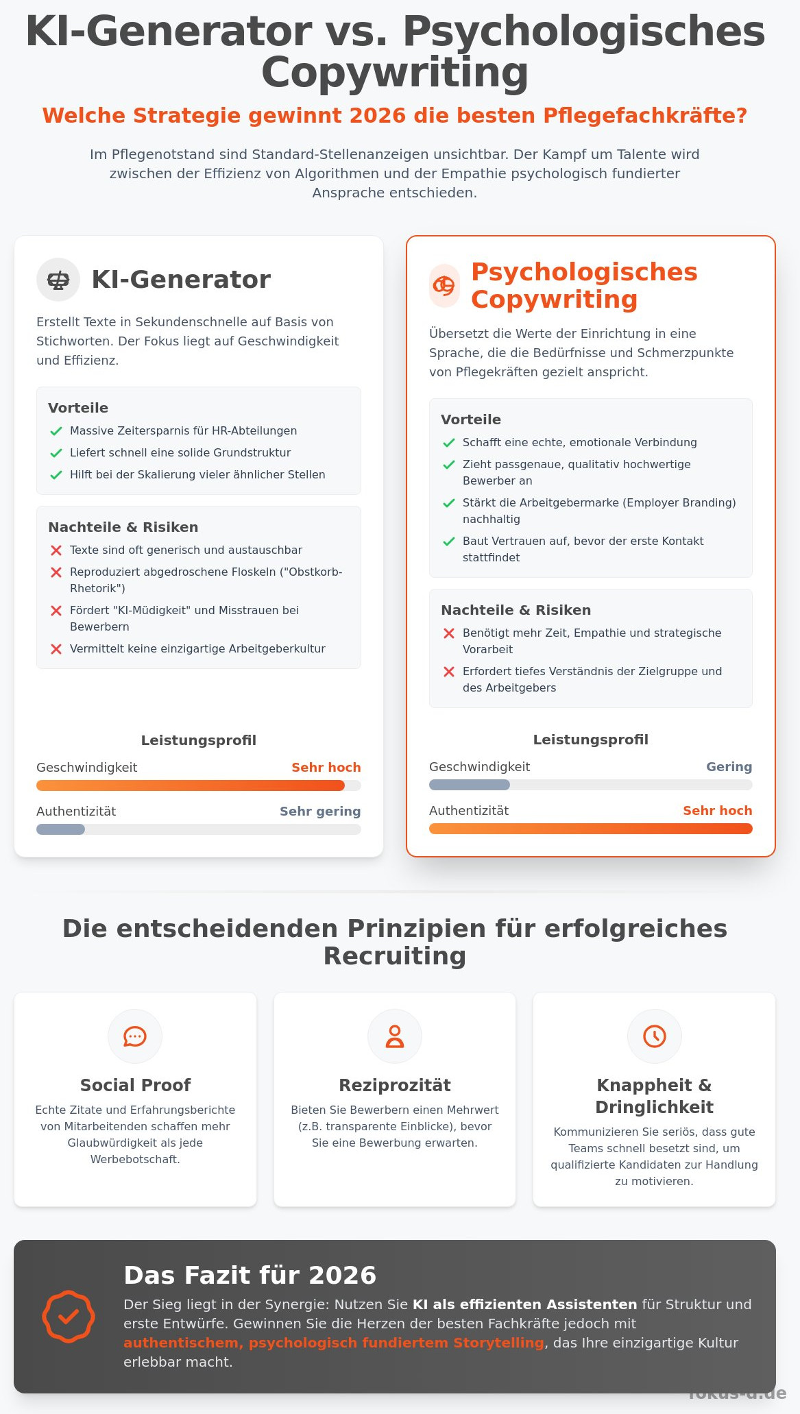 Erfahren Sie, ob automatisierte KI-Texte oder eine psychologisch fundierte Ansprache den entscheidenden Unterschied im hart umkämpfen Pflegemarkt machen und welche Strategie 2026 den Kampf um die besten Fachkräfte gewinnt.