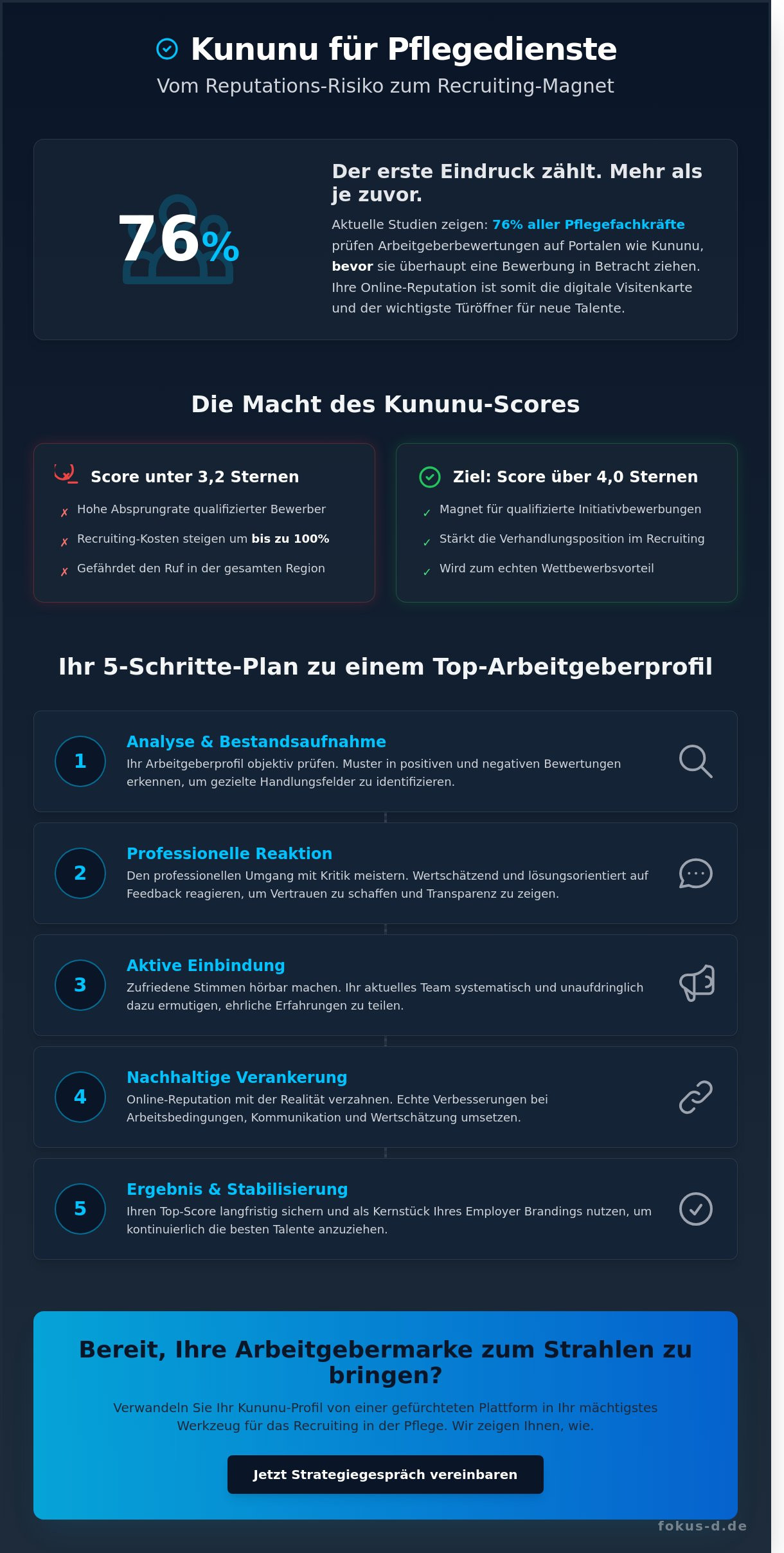 Den eigenen Kununu Score verbessern als Pflegedienst erfordert Mut und Ausdauer. Die wichtigsten Hebel für Ihren Erfolg im Jahr 2026 sind: