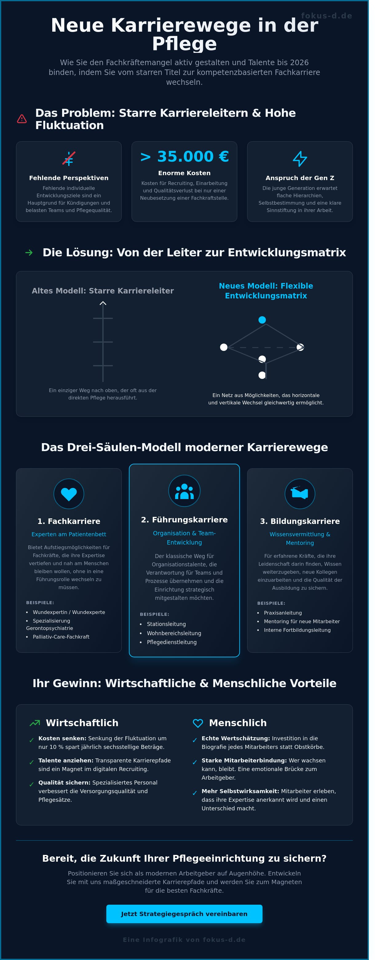 Die drei Säulen aus fachlicher Spezialisierung, Führungskompetenz und pädagogischer Bildung bieten den notwendigen Rahmen für eine moderne Karrierematrix. Wir von fokus digital GmbH begleiten Sie bei diesem Prozess mit unserer spezialisierten Expertise in der Pflege- und Sozialwirtschaft. Unsere Strategien basieren auf datengetriebenen Ansätzen für messbaren Recruiting-Erfolg und einer Kommunikation auf Augenhöhe. Wir verstehen die täglichen Herausforderungen Ihres Alltags genau. Gemeinsam bringen wir zusammen, was zusammengehört: qualifizierte Menschen und wertschätzende Arbeitgeber.