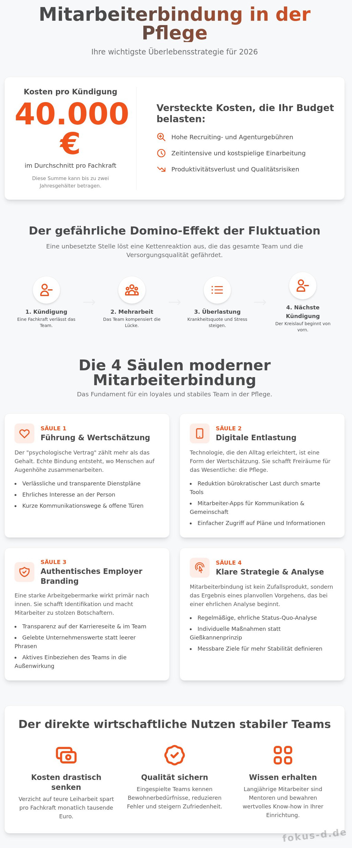 - Erfahren Sie, warum eine strategische Mitarbeiterbindung pflege-Einrichtungen vor immensen Fluktuationskosten schützt, die pro Kündigung bis zu zwei Jahresgehälter betragen können.