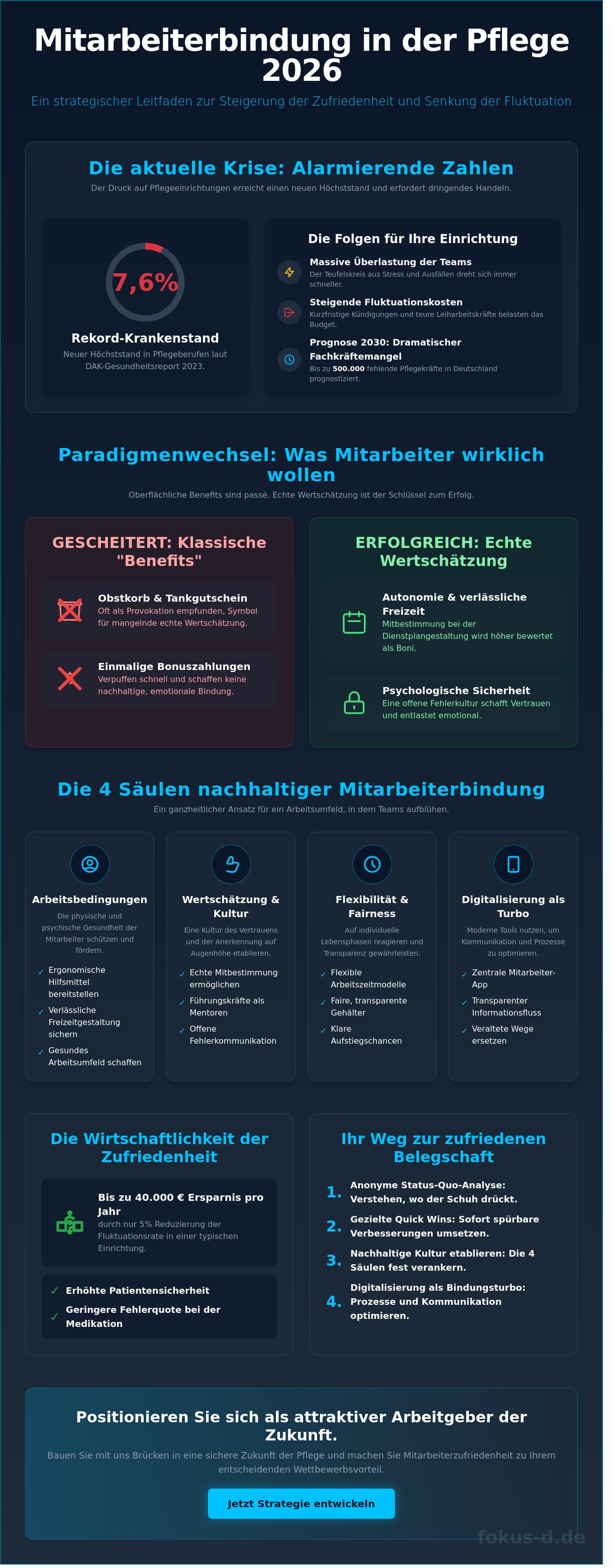 In diesem strategischen Leitfaden erfahren Sie, wie Sie durch echte Wertschätzung auf Augenhöhe und den gezielten Einsatz digitaler Innovationen eine neue, gesunde Kultur in Ihrer Einrichtung etablieren. Wir versprechen Ihnen praxiserprobte Ansätze, die über bloße Lippenbekenntnisse hinausgehen und Ihre Attraktivität als Arbeitgeber bis zum Jahr 2026 nachhaltig sichern. Wir analysieren die notwendigen Schritte für ein stabiles Teamgefüge und zeigen Ihnen, wie Sie Fluktuationskosten senken und gleichzeitig die Lebensqualität Ihrer Fachkräfte spürbar verbessern. Es ist Zeit, gemeinsam Brücken in eine sichere Zukunft der Pflege zu bauen.