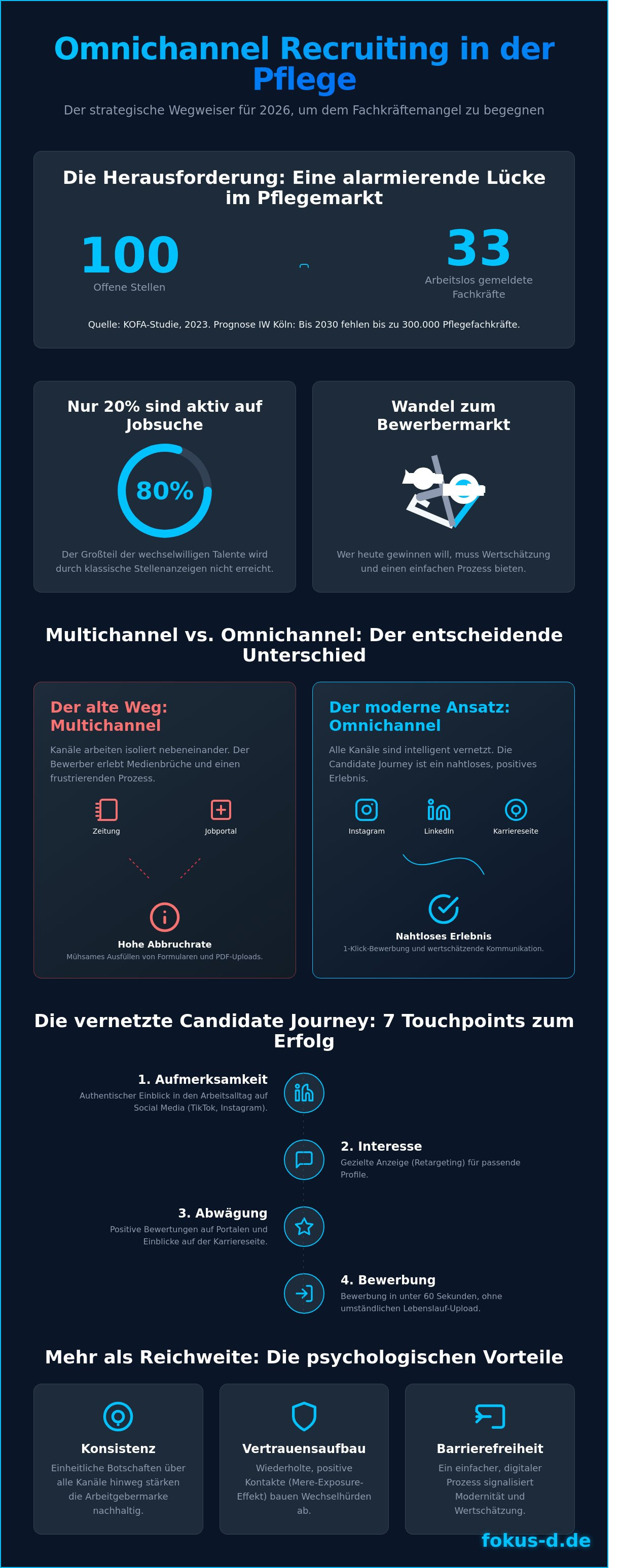 - Verstehen Sie den entscheidenden Unterschied zwischen Multichannel und der vernetzten Strategie des Omnichannel Recruiting, um Bewerbungshürden für Pflegekräfte konsequent abzubauen.