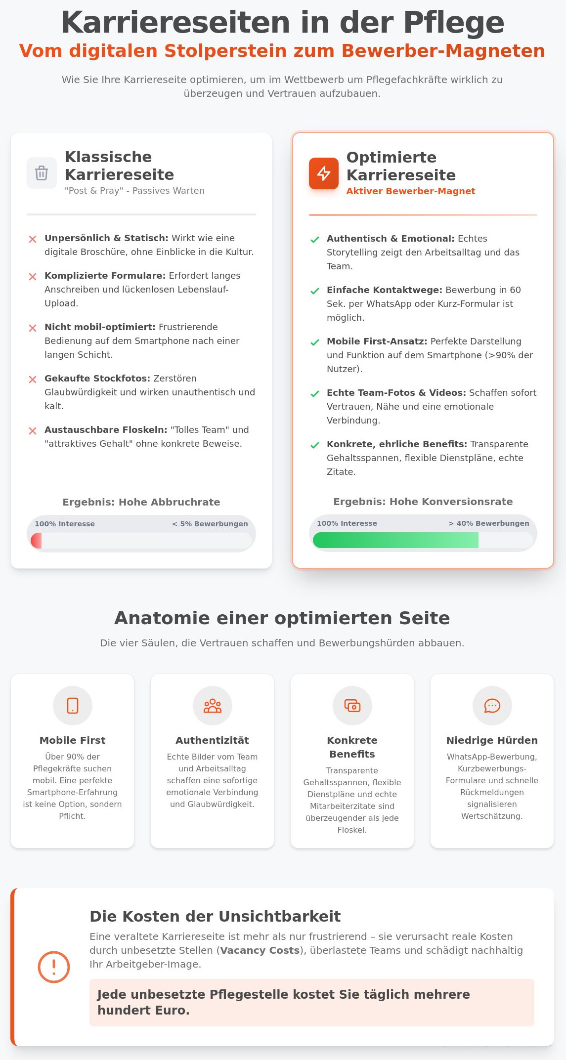 Eine veraltete oder schlecht funktionierende Karriereseite verursacht mehr als nur Frust. Sie verursacht reale, messbare Kosten. Jede unbesetzte Stelle erzeugt sogenannte "Vacancy Costs". Diese setzen sich zusammen aus den Kosten für teure Zeitarbeitskräfte, der Überlastung des bestehenden Teams, die zu Kündigungen führen kann, und den potenziellen Einnahmeverlusten, wenn Betten nicht belegt werden können. Eine unbesetzte Pflegestelle kann eine Einrichtung schnell mehrere hundert Euro pro Tag kosten.