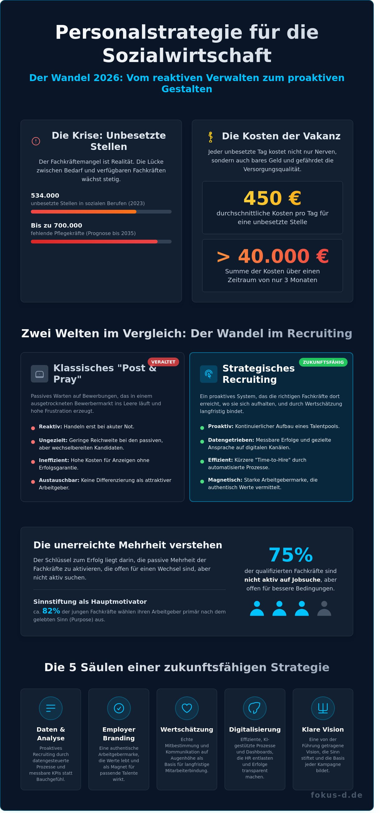 Die Zeit der leeren Versprechungen ist im Jahr 2026 endgültig vorbei. Wer heute eine Personalstrategie für die Sozialwirtschaft entwickeln möchte, muss verstehen, dass klassisches Recruiting am Ende ist. Das Prinzip "Post & Pray", also das bloße Schalten einer Anzeige und das anschließende Warten auf Bewerber, funktioniert in der Pflege nicht mehr. Über 75 Prozent der qualifizierten Fachkräfte suchen nicht aktiv nach einem neuen Job, sind aber offen für bessere Bedingungen. Eine moderne Strategie ist daher die Symbiose aus einer starken Identität, digitaler Sichtbarkeit und messbaren Prozessen.