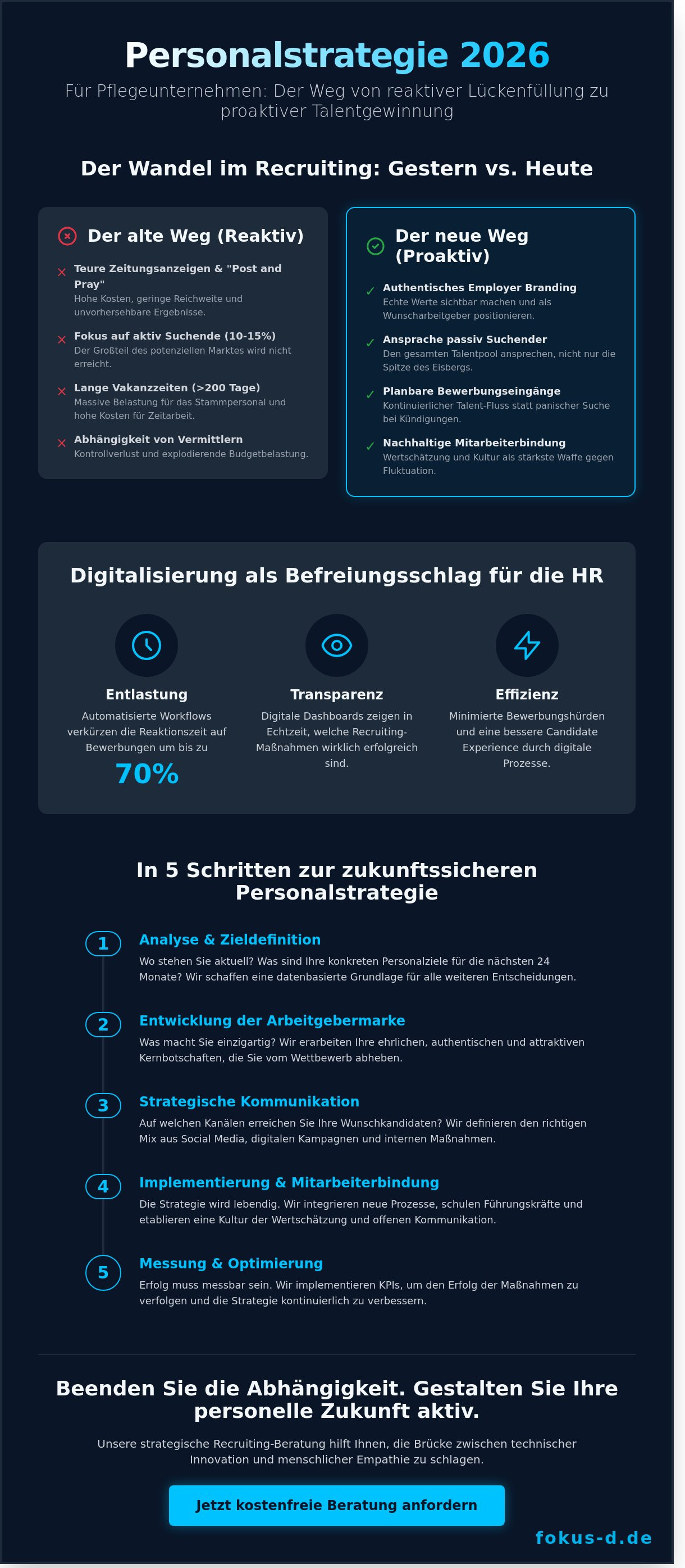 Fokus-D begleitet Sie als spezialisierter Partner der Sozialwirtschaft auf diesem Weg. Wir bringen die Erfahrung aus über 100 erfolgreichen Projekten in der Pflege direkt in Ihr Unternehmen ein. Mit unserer hauseigenen Recruiting-KI und einer transparenten Dashboard-Lösung machen wir Ihren Erfolg sichtbar und steuerbar. Wir sprechen Ihre Sprache und wissen genau, wie wir Fachkräfte nicht nur finden, sondern durch Augenhöhe und Fairness langfristig binden.