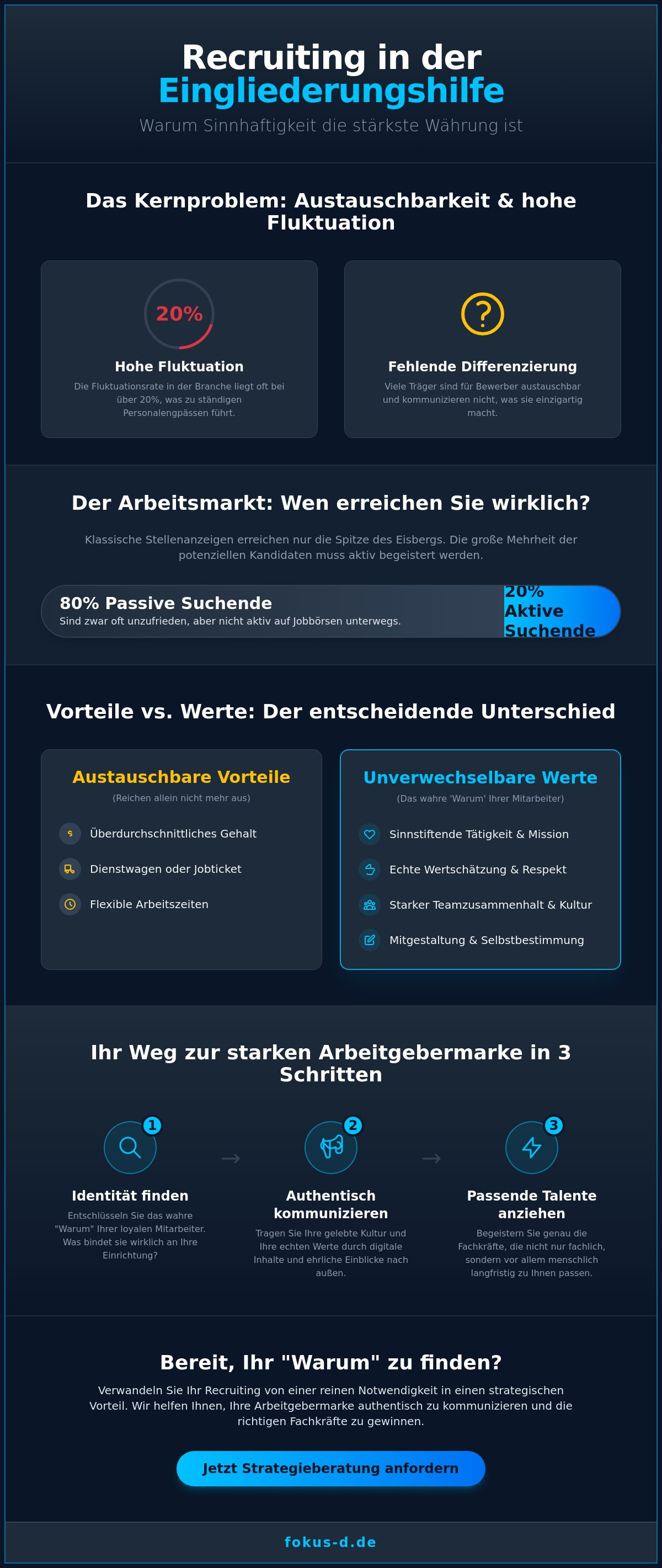 Recruiting in der Eingliederungshilfe ist eine zutiefst menschliche Aufgabe. Doch Herzblut allein reicht im digitalen Wettbewerb nicht mehr aus, um die passenden Fachkräfte langfristig zu binden. Bei Fokus-D verbinden wir tiefe Empathie mit präziser Analytik. Wir sind überzeugt, dass datengetriebene Prozesse und menschliche Wertschätzung keine Gegenspieler sind. Vielmehr helfen uns Zahlen dabei, genau die Menschen zu finden, die Ihre Vision teilen. Wir machen sichtbar, warum Mitarbeiter bei der Einrichtung arbeiten und was Ihre Unternehmenskultur im Kern auszeichnet. Als spezialisierter Partner für die Sozialwirtschaft übersetzen wir Ihre Werte in messbare Erfolge.