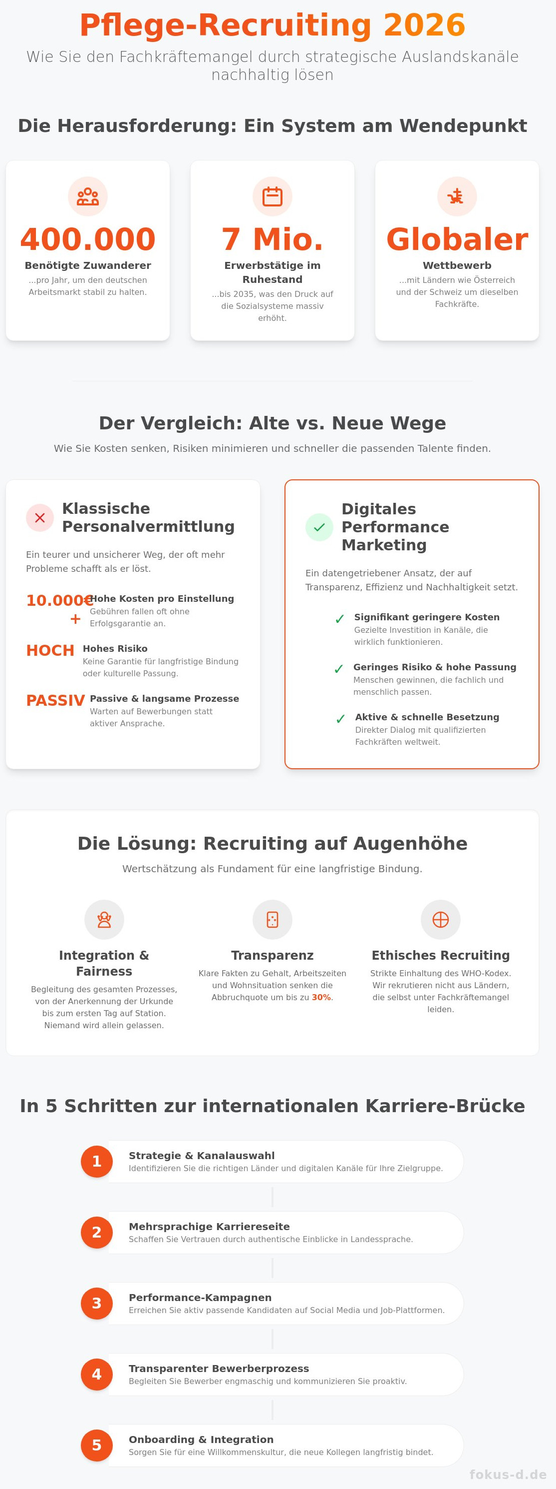 Wir bei Fokus-D verstehen uns als Brückenbauer zwischen Ihrer Einrichtung und qualifizierten Fachkräften weltweit. In einer Zeit, in der der Fachkräftemangel die Pflegebranche vor existenzielle Herausforderungen stellt, reicht klassisches Anzeigen-Schalten nicht mehr aus. Unser Ansatz basiert auf dem Prinzip der Wertschätzung und der Kommunikation auf Augenhöhe. Wir bringen zusammen, was zusammengehört, indem wir die passenden Recruiting-Kanäle im Ausland für Ihre spezifischen Bedürfnisse identifizieren und bespielen.