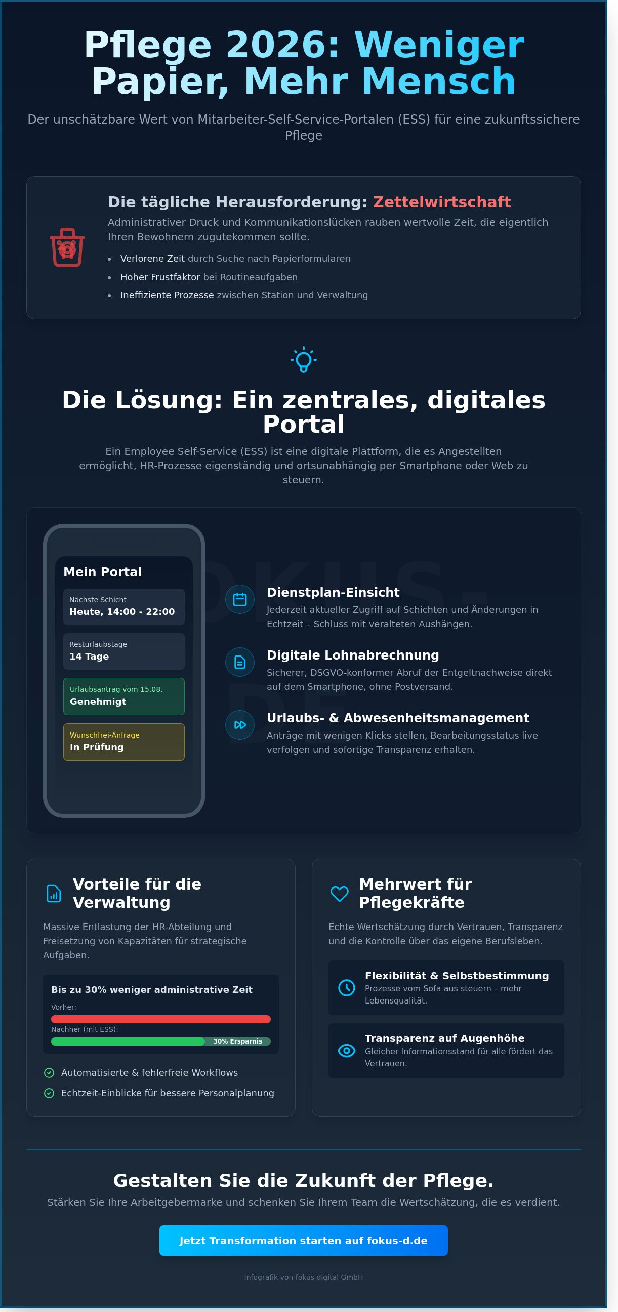 Dieser Leitfaden für das Jahr 2026 zeigt Ihnen Schritt für Schritt, wie Sie die digitale Transformation rechtssicher und mit einer hohen Akzeptanz in der Belegschaft meistern. Wir versprechen Ihnen einen praxisnahen Weg, der Ihre Verwaltung spürbar entlastet und Ihre Arbeitgebermarke nachhaltig stärkt. Erfahren Sie in den folgenden Abschnitten, wie Sie digitale Barrieren abbauen, volle Transparenz bei Lohnabrechnungen schaffen und Ihre Teams aktiv in die Gestaltung ihrer eigenen Arbeitswelt einbinden. Wir begleiten Sie dabei, die Brücke zwischen moderner Technik und menschlicher Pflege erfolgreich zu schlagen.