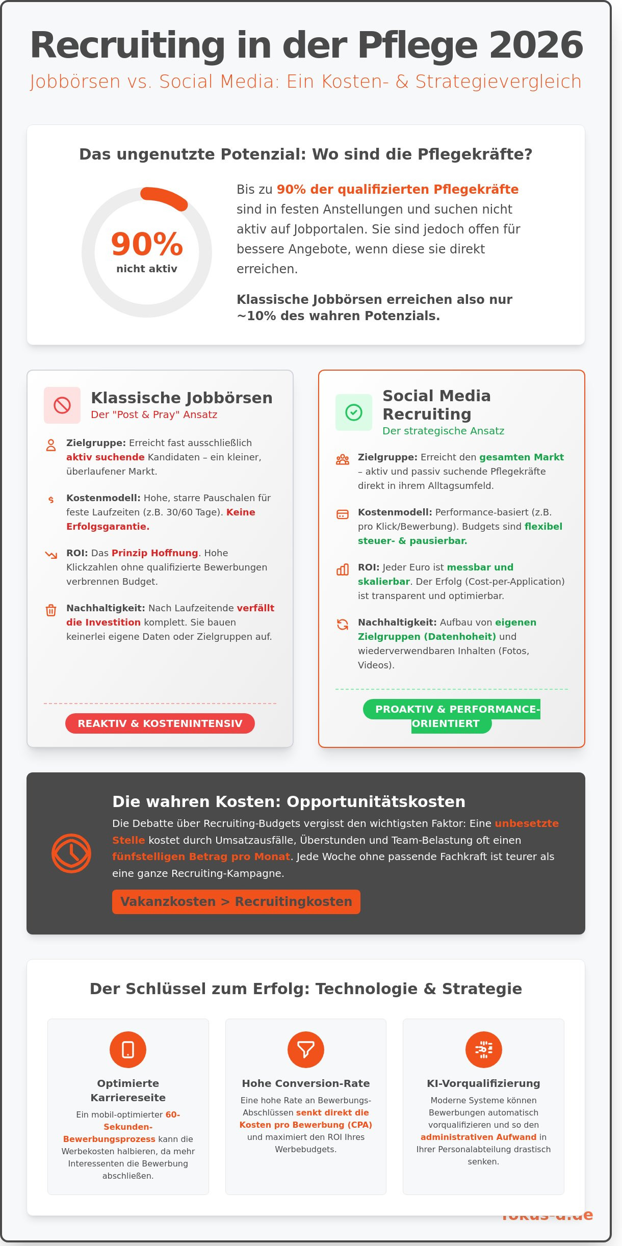 Der Kostenvergleich zwischen Stellenanzeigen auf Jobportalen und Kampagnen in sozialen Netzwerken fällt im Jahr 2026 eindeutig aus. Wer in der Pflege nachhaltig Fachkräfte gewinnen will, muss den Mut zur digitalen Transformation haben. Der Wechsel von unkalkulierbaren Ausgaben hin zu planbaren Investitionen in die eigene Arbeitgebermarke ist kein Trend, sondern eine unternehmerische Notwendigkeit. Planbarkeit, Transparenz und die direkte Ansprache der richtigen Menschen sind die Währungen im modernen Recruiting – und Social Media ist der effektivste Weg, sie zu nutzen.