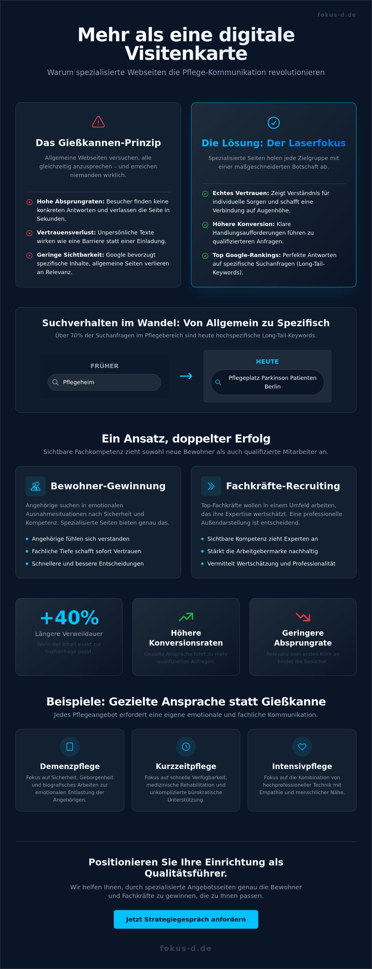 - Erfahren Sie, wie spezialisierte Seiten für einzelne Pflegeangebote als konversionsstarke Brücke fungieren, um Ihre Expertise klar von herkömmlichen Leistungsbeschreibungen abzuheben.