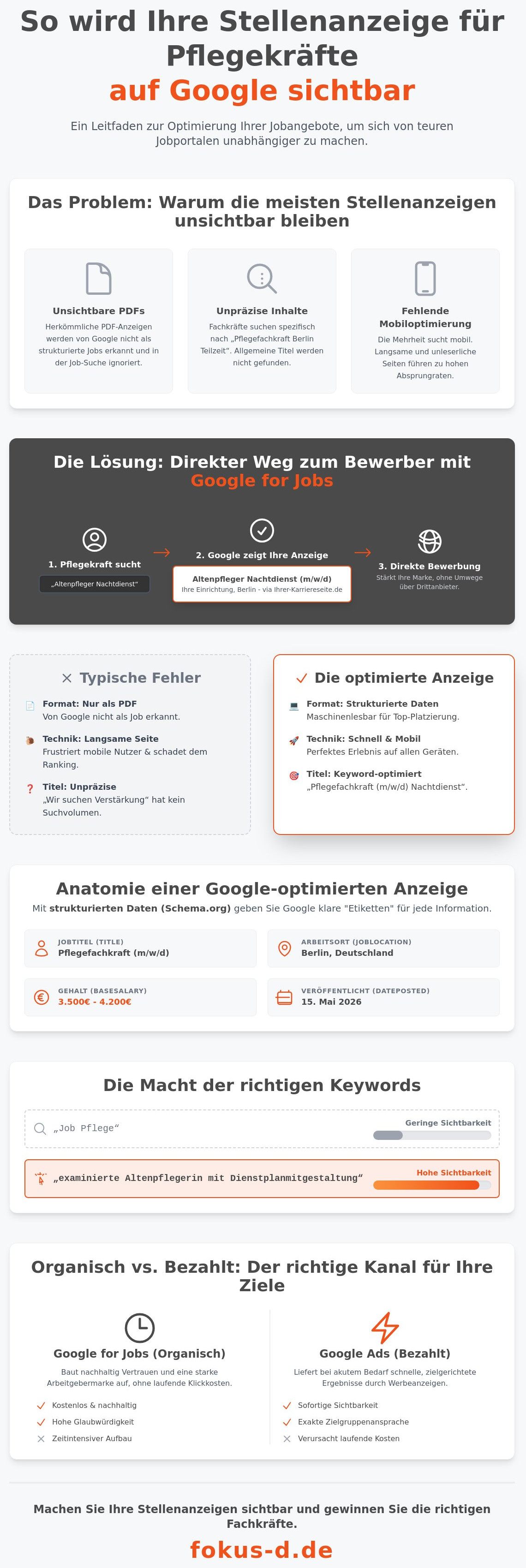 <p>In diesem Artikel zeigen wir Ihnen, wie Sie Ihre <strong>Stellenanzeige für Pflegefachkräfte bei Google</strong> so optimieren, dass sie nicht nur sichtbar wird, sondern auch die passenden Kandidatinnen und Kandidaten überzeugt. Erfahren Sie, welche technischen und inhaltlichen Stellschrauben Sie drehen müssen, um im Jahr 2026 erfolgreich Personal zu gewinnen und sich von Jobbörsen unabhängiger zu machen.</p>