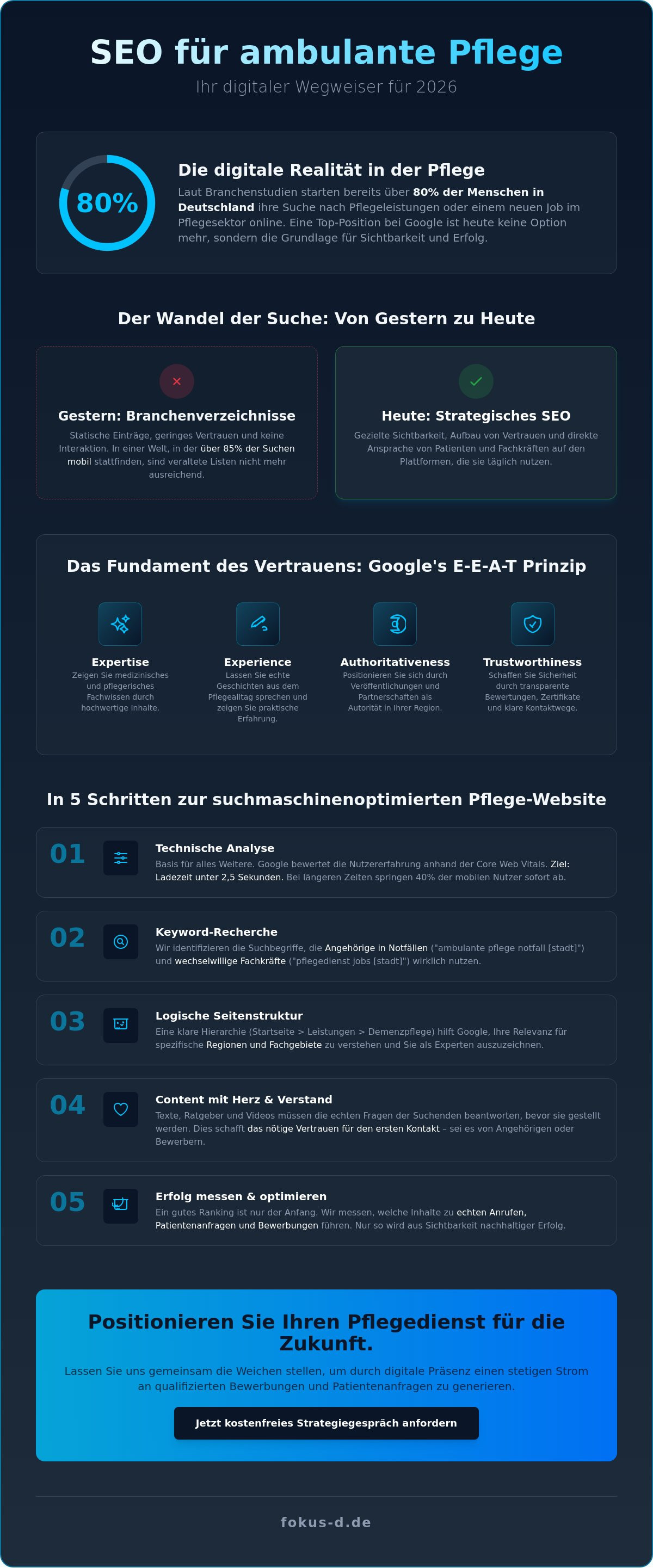 Suchmaschinen-Optimierung für ambulante Pflege ist im Jahr 2026 der entscheidende digitale Brückenbauer. Sie verbindet Menschen in emotional belastenden Situationen mit den passenden Hilfsangeboten. Wenn Angehörige nachts um zwei Uhr nach Unterstützung suchen, ist SEO das Licht, das ihnen den Weg zu Ihrem Dienst weist. Es geht nicht mehr nur um technische Kniffe, sondern um den Aufbau von echtem Vertrauen noch vor dem ersten Telefonat. Wir bei Fokus-D sehen SEO als ein Werkzeug, das Transparenz schafft und Pflegebedürftigen sowie Fachkräften zeigt, dass Ihr Dienst für Qualität und Menschlichkeit steht.