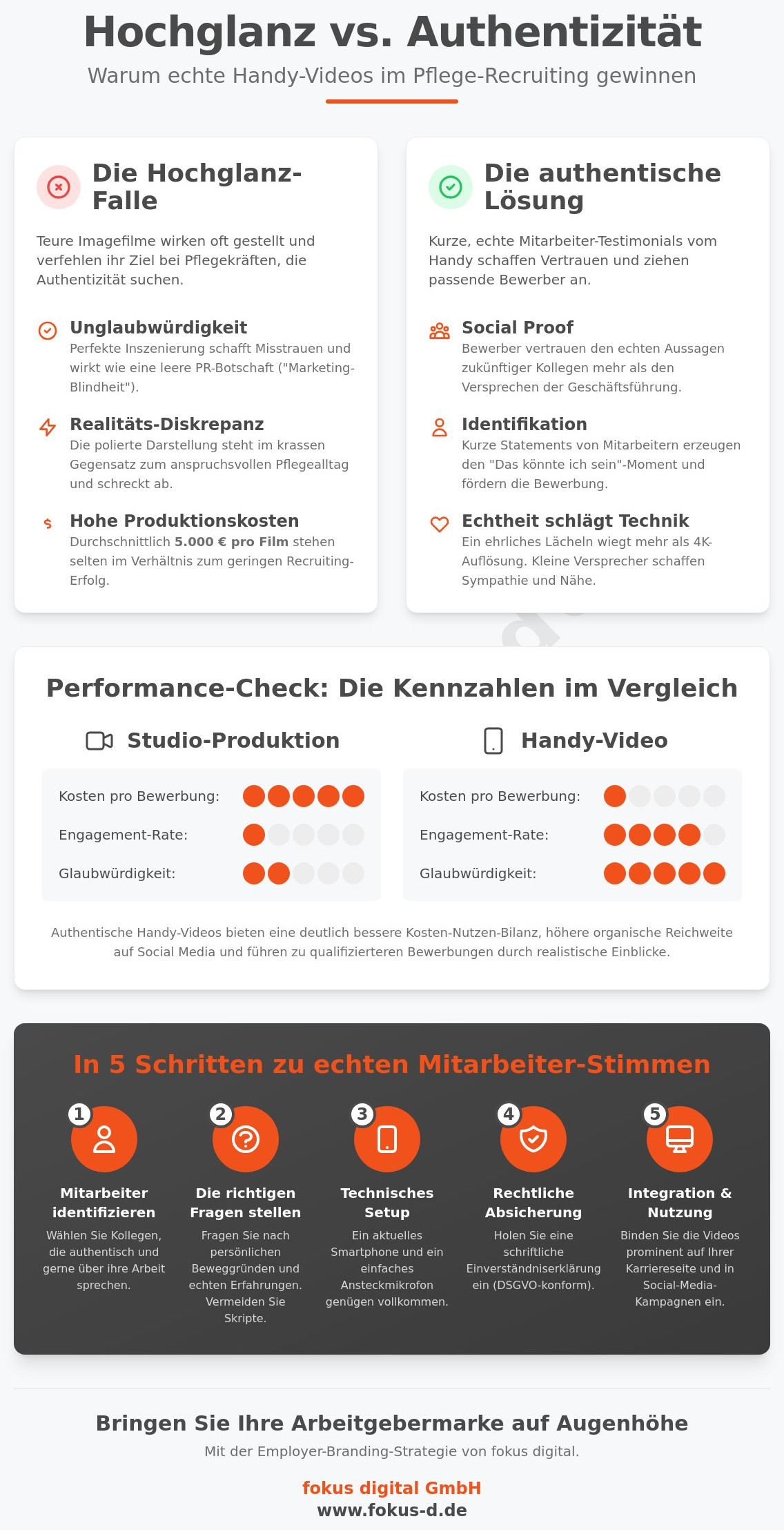 - Unglaubwürdigkeit polierter Imagefilme: Pflegekräfte haben eine feine Antenne für Authentizität. Hochglanz-Videos wirken oft gestellt und verlieren dadurch an Glaubwürdigkeit.