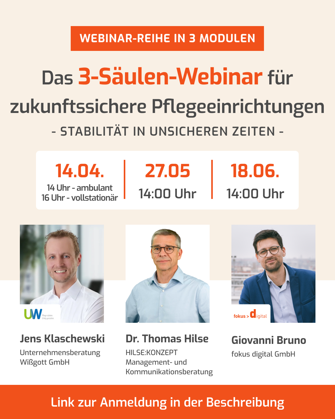 Wir empfehlen jedoch die Teilnahme an der gesamten Webinar-Reihe, da die Inhalte systematisch aufeinander aufbauen und zusammen ein vollständiges Gesamtkonzept für eine wirtschaftlich und organisatorisch stabile Pflegeeinrichtung vermitteln.