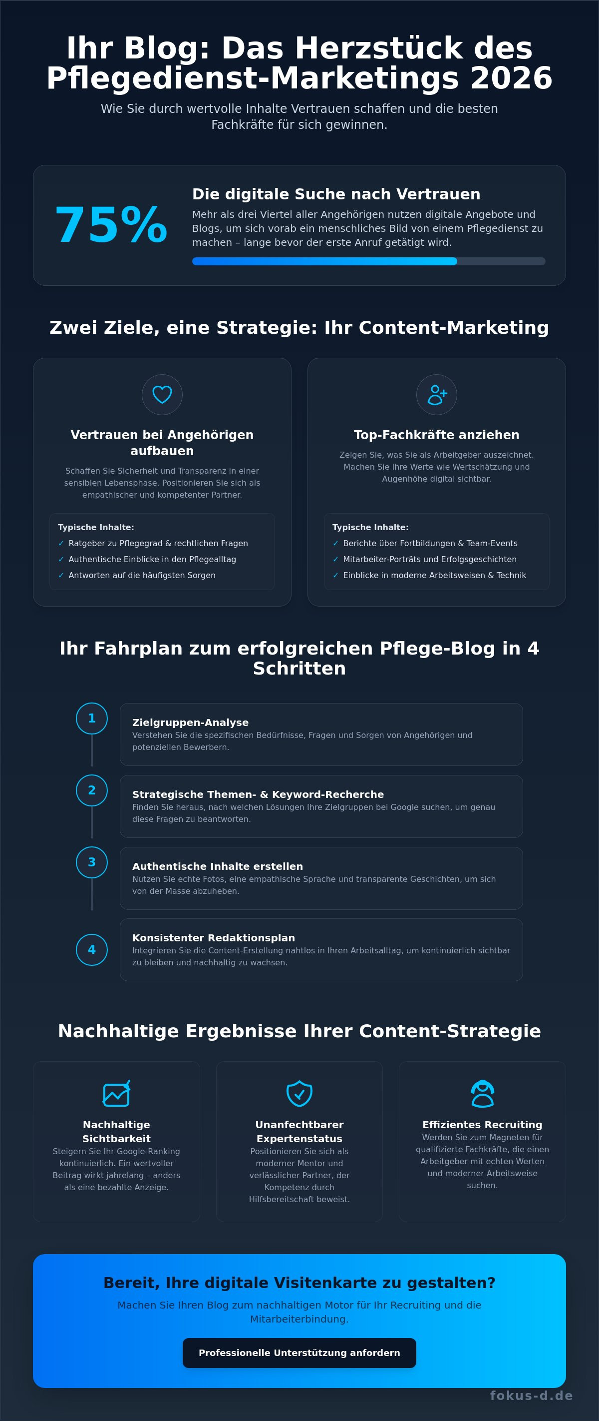 Ein lebendiger Blog ist weit mehr als eine bloße digitale Visitenkarte. Er bildet das Fundament, auf dem Sie Vertrauen zu Angehörigen aufbauen und gleichzeitig qualifizierte Fachkräfte von Ihrer Unternehmenskultur überzeugen. In diesem Leitfaden haben Sie die entscheidenden Schritte gelernt, wie man nützliche Blog-Inhalte für Pflegedienste entwickelt , die durch eine klare Zielgruppen-Analyse und systematische Themenfindung echte Relevanz erzeugen. Wer heute in wertvolle Inhalte investiert, schafft die Basis für ein stabiles Team im Jahr 2026.